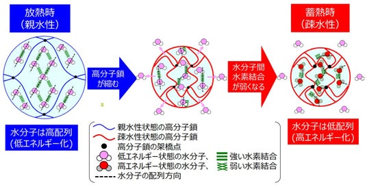開発した感温性高分子ゲルは放熱時(低温時)に親水性であるため、感温性高分子ゲルと水は分離せずに混ざりあい、多くの水分子は感温性高分子ゲル内に高配列で存在しています。感温性高分子ゲルが温められると疎水性への構造相転移反応が起こり、高分子鎖(※11)が縮みます。高分子鎖が縮んで高分子混雑環境になると、高分子から離れた網目構造の中心付近にいた水分子は高分子の狭い網目構造に束縛されないため、すり抜けて感温性高分子ゲルの外側に飛び出し、感温性高分子ゲルと水は分離します。一方、高分子の近くにいた水分子は高分子の狭い網目構造に束縛され閉じ込められることで水素結合反応が弱くなり、水分子の配列構造が乱れて高エネルギー化します。このように、感温性高分子ゲルの構造相転移反応と、水分子間の水素結合反応からなる連成反応による水分子の高エネルギー化を利用し、高密度に蓄熱できることを世界で初めて(※4)実証しました。