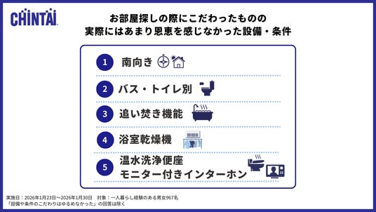 お部屋探しのリーディングカンパニー株式会社CHINTAI(本社:東京都港区 代表取締役社長 奥田倫也、以下CHINTAI)は、一人暮らし経験のある10代~30代の男女967名を対象に、賃貸物件の設備・条件に関する意識調査を実施しました。
