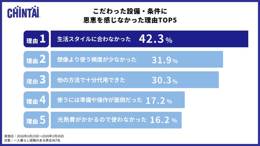 こだわった設備・条件にも関わらず、恩恵を感じなかった理由としては「生活スタイルに合わなかった」が42.3%で最多の理由に。次いで「想像より使う頻度が少なかった」(31.9%)、「他の方法で十分代用できた」(30.3%)という理由が寄せられたことから、“設備・条件と自分の暮らしとの相性”が設備・条件に対して価値を感じるかに影響を与えていることがわかりました。