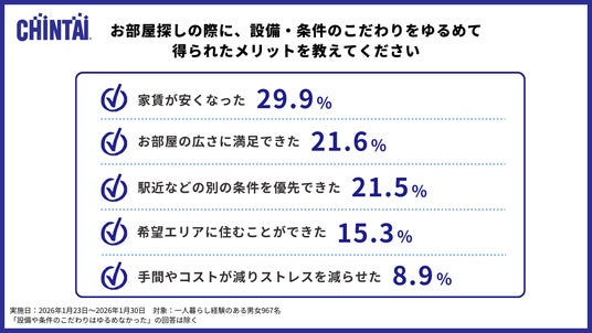 設備や条件のこだわりをゆるめたことで得られたメリットについては、「家賃が安くなった」(29.9%)が最も多い結果となりました。次いで、「広さに満足できた」(21.6%)、「駅近など別の条件を優先できた」(21.5%)が続いています。