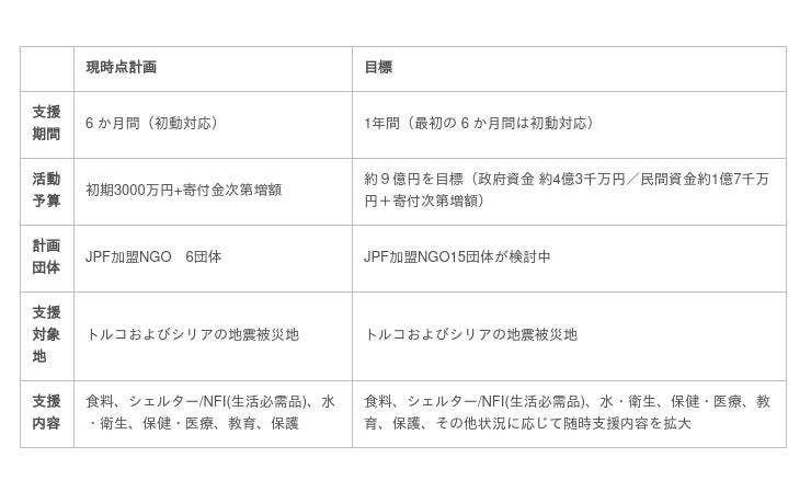 2月24日時点で、JPF に加盟する45の NGO のうち、4団体が支援活動を開始し、15団体が出動を計画しています。今回の支援拡充を受け、新たなNGOの出動を含む支援内容の充実を検討しています。JPF では、各加盟 NGO が持つさまざまな強みを結集することで、トルコ・シリア両国への最適かつ総合的な支援を行います。