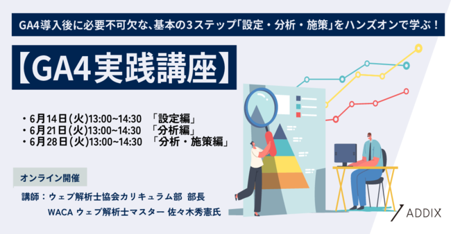 株式会社ADDIX(所在地:東京都港区、代表取締役:酒井大輔 以下、ADDIX)は、「Google アナリティクス 4 (以下GA4と略)実践講座(https://service.addix.co.jp/seminar/googleanalytics4_practice)」を開催いたします。GA4導入後に必要不可欠な、基本の3ステップ「設定・分析・施策」がハンズオンで学べます。既にGA4をご利用されているWebご担当者をはじめ、GAからGA4への切り替えをお考えのご担当者やこれからGA4を使えるようになりたいとお考えのご担当者向けの内容となります。