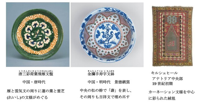 出品作品例として、唐時代の名品「唐三彩荷葉飛雁文盤(とうさんさいかようひがんもんばん)」や、明時代の「金襴手寿字文鉢(きんらんでじゅじもんばち)」、またアナトリア中央部キルヒシェール産の絨毯(19世紀初期)があります。