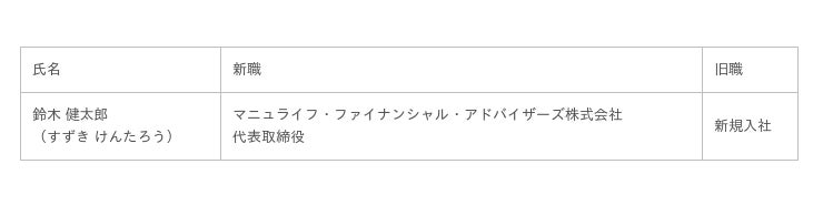 マニュライフ生命保険株式会社(取締役代表執行役社長兼CEO:ブノワ・メスレ、本社:東京都新宿区、以下「マニュライフ生命」)の全額出資子会社であるマニュライフ・ファイナンシャル・アドバイザーズ株式会社(代表取締役:野田 淳、本社:東京都港区)は、下記の通り役員人事を決定しましたので、お知らせいたします。