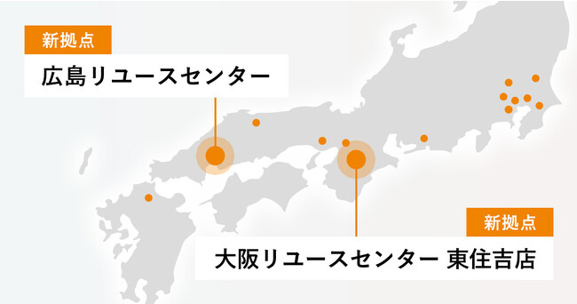 こういった課題を解決し、西日本エリアの買取強化を図るため、9月中旬以降(都合により前後する可能性があります)に新たに、大阪市内と広島市内の2か所に新拠点を開設いたします。大阪府内へのリユースセンター開設は、吹田市に続く2拠点目で、広島市内への開設は、中国エリア初となります。この拠点開設により、全国にある当社グループのリユースセンターは、16拠点へと拡大いたします。