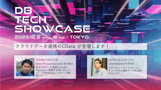 CData Software Japan 合同会社(本社:アメリカノースカロライナ州、日本オフィス:宮城県仙台市、代表社員 職務執行者:疋田 圭介、以下CData)は、2023年12月6日-12月8日に開催される国内最大規模のデータとデータベース関連のカンファレンスである『db tech showcase 2023』をスポンサーします。イベントでは、CData のプロフェッショナルがGoogle BigQuery データ連携パターンや基幹システムデータのREST API 構築をテーマに登壇します。