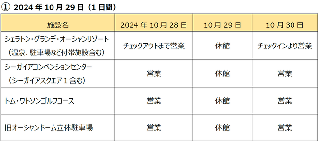 フェニックスリゾート株式会社(宮崎市:代表取締役 社長執行役員 片桐孝一)が運営する、フェニックス・シーガイア・リゾートは、受変電設備の更新、及びそれに伴うメンテナンス工事を、1.2024年10月29日(1日間)と、2.2025年1月5日~1月30日(26日間)の合計27日間で実施します。これに伴い、当リゾート内の下記の施設を休館させていただきます。