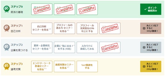 本サービスでは、⓪就活の基礎、1.自己分析、2.企業を見つける、3.選考対策の4ステップを順番に取り組んでいくことで、効率的に就活を進めることができます。また、各ステップを完了することで、様々な特典と交換できる”アカリクポイント”を獲得できます。就活に対する敷居の高さを軽減し、ゲーム感覚で進められるのが特徴です。