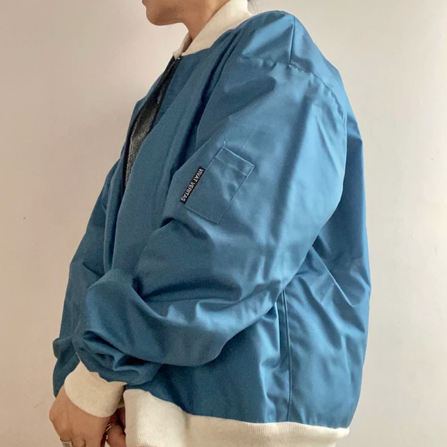 廃漁網をリサイクルした生地と着物生地のリバーシブルジャケット。