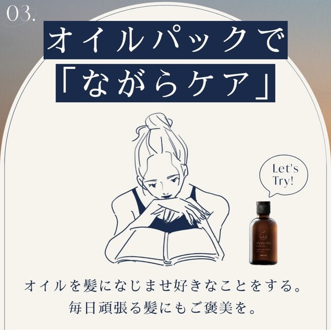 「ゆず油」特設サイトでは、『疲れた時に体を休めるのと同じように、ダメージを受けている髪にも休息が必要』という考えのもと、オイルケアで髪をいたわるケア方法を公開しています。たっぷりのヘアオイルを髪になじませ時間をかけてオイルパックをすることで、髪の芯までうるおいをあたえ、まるで美容室帰りのように、広がる髪が毛先までしっとりまとまります。