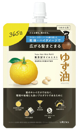 商品説明 : 乾燥・ハイダメージで広がる髪に。水分+油分Wのうるおいで保水&補修ケアして、広がる髪も毛先までしっとりまとまる無添加※オイルミスト。爽やかな天然ゆずの香り。(※シリコーン・合成香料・着色料・鉱物油・紫外線吸収剤・界面活性剤・パラベン 全て不使用)