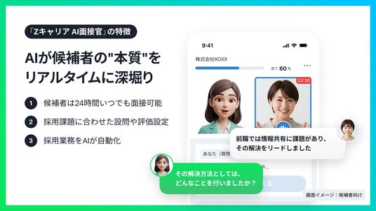 『Zキャリア AI面接官』は、採用活動の一部をAIによって代替し、面接工数の削減や選考リードタイム短縮を実現する採用支援サービスです。候補者は24時間365日スマートフォン一つで面接に臨むことができ、選考への物理的・心理的負担を軽減し、利便性・柔軟性のある面接機会の拡大に繋がります。採用企業は、応募検討層を広く取り込むことが可能となり、夜間や休日を含む時間や場所の制約を受けない柔軟な選考体制を構築できます。AI面接官が統一基準で候補者のポテンシャルを多角的に評価・可視化することで、候補者・採用企業の双方間での採用におけるミスマッチの削減と公平性の確保に貢献します。