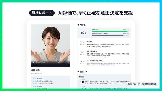 求職者の話すテンポや抑揚、表情やジェスチャー、反応速度(言語情報・非言語情報)などの評価をスコアで表示し、面接担当者の意思決定をサポートします。