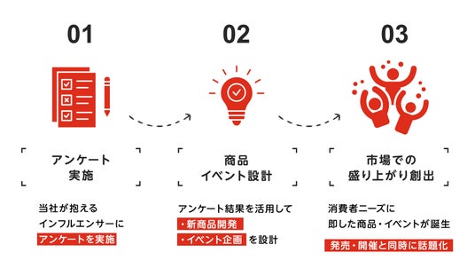 本サービスは、商品開発やイベント企画における「本当に欲しい」「投稿したくなる」ポイントを、インフルエンサーのリアルな声をもとに可視化・反映するためのサービスとなり、これにより、企業はバズる(発信されやすい)企画を設計段階から織り込むことが可能になります。