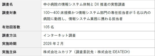 本調査は、中小病院の情報システム部門が置かれている現状を数値で示すことで、医療機関の経営層や行政機関が現場の実情を把握し、具体的な対策を講じるための基礎資料となることを目的としています。