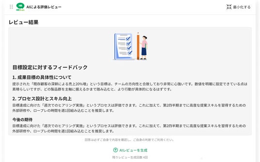 株式会社HRBrain(本社:東京都港区/代表取締役CEO:堀 浩輝、以下「当社」)は「HRBrain 人事評価」において生成AIを活用して目標設定の質を向上させる「目標のAIレビュー機能(以下、「本機能」)」を新たにリリースしました。