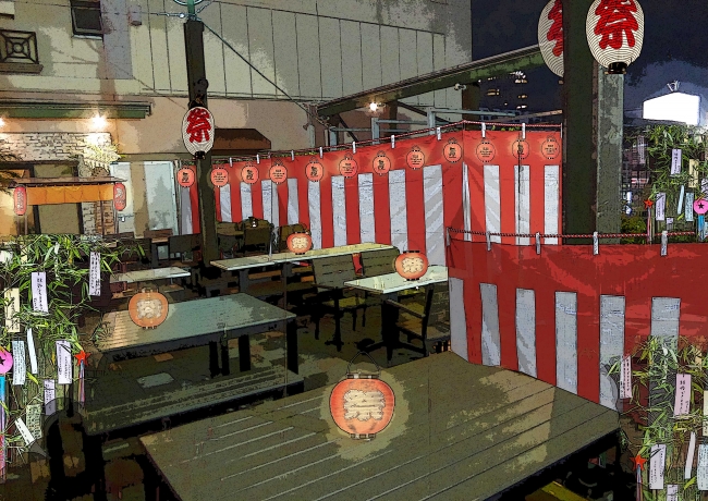 令和元年となる今年は、「祭り」がテーマ。日本の各地域で行われるような夏祭りをイメージした装飾や、屋台フードの定番である「焼きとうもろこし」「フランクフルト」「焼きそば」などをご用意し、渋谷駅直結という都会のど真ん中であっても、祭りの雰囲気を楽しむことができる空間となります。
