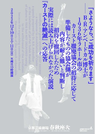 学校法人瓜生山学園 京都芸術大学 舞台芸術研究センターは、2022年12月10日(土)、12月11日(日)に『「さようなら、ご成功を祈ります」――B.R.アンベードカル博士が1936年ラホール市のカースト撤廃協会の招待に応じて準備したものの協会側が内容が耐え難いと判断し招待を撤回したため実際には読み上げられなかった演説『カーストの絶滅』への応答』を、京都芸術劇場 春秋座で上演いたします。