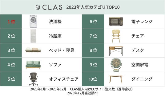 認知度No.1(※1)の家具と家電のレンタル・サブスク「CLAS(クラス)」(https://clas.style/)を運営する、持たない、捨てない社会をつくる株式会社クラス(本社:東京都目黒区、代表取締役社長:久保 裕丈)は、CLASにおける2023年の年間人気カテゴリーのランキングと人気アイテムを発表いたします。