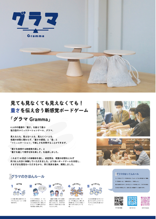 「グラマ」は、視覚障害を持つ人と持たない人が共に遊び、楽しく相互理解を深めることを目的に開発したボードゲームです。日頃あまり意識していない「重さの感覚」と、コミュニケーションを頼りに、プレイヤーそれぞれが持つ巾着袋の「重さ」を揃えていき、天秤に乗せて釣り合えば成功、崩れてしまうと失敗、という協力型のコミュニケーションゲームとなっています。