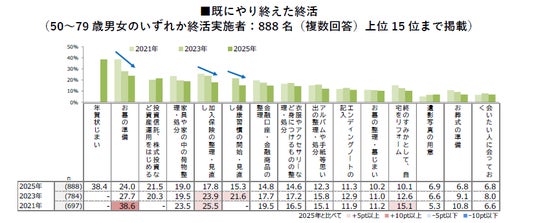 既にやり終えた終活で最も高いものは「年賀状じまい」「終活」の認識で最も高いのは「金融口座・金融商品の整理」 「お墓の整理・墓じまい」は増加傾向。