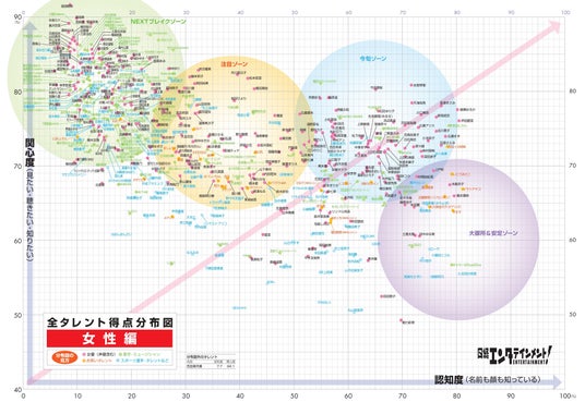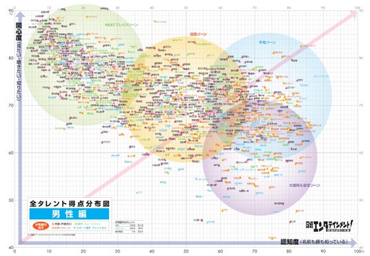 さらに調査対象全タレントの認知度、関心度が一目で分かる「全タレント1280組得点分布図」をピンナップ形式で掲載しています。「全タレント1280組特典分布図」は、日経エンタテインメント!Web(日経クロストレンド内)で確認いただけます。6月5日より同サイト上で、特集記事を順次公開します(特集は以下よりご覧いただけます)