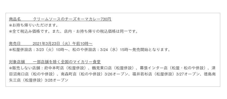 このたび松屋フーズ(本社:東京都武蔵野市、代表取締役社長:瓦葺一利)では、カレー専門店「マイカリー食堂」におきまして、2021年3月23日(火)午前10時より「クリームソースのチーズキーマカレー」を発売いたします。