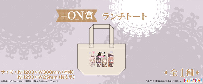 商品は、クッション、マグカップ、アクリルスタンドキーホルダー、缶バッジ、ミニ色紙、「+On Challenge」景品のランチトートなど、デフォルメイラストを使用した「KuZiPA!」でしか手に入らないアイテムが盛りだくさん!