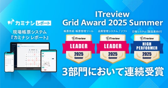 株式会社カミナシ(本社:東京都千代田区、代表取締役:諸岡 裕人、以下「カミナシ」)が提供する現場帳票システム『カミナシ レポート』は、アイティクラウド株式会社(本社:東京都港区、代表取締役社長兼CEO 黒野源太、以下「アイティクラウド」)が主催する「ITreview Grid Award 2025 Summer」において、「帳票作成・帳票管理ツール」「品質管理システム/ソフト」の2部門で最高位の「Leader」、「日報システム(製造業向け)」部門で「High Performer」を連続受賞しました。