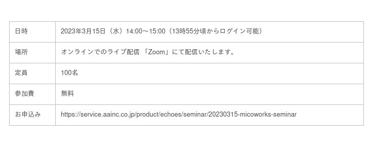 お申込みページ:https://service.aainc.co.jp/product/echoes/seminar/20230315-micoworks-seminar