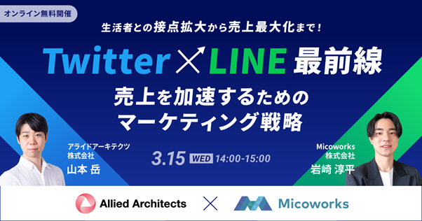 本セミナーでは、Twitterマーケティング支援を行うアライドアーキテクツ株式会社と、LINEマーケティングの支援を行うMicoworks株式会社より、Twitter・LINEでのマーケティングに関して、押さえておくべき最新動向から掛け合わせた集客事例、コンバージョン率向上事例まで、活用必勝法を徹底解説いたします。