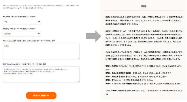 「就活AI」は、入力されたキーワードやエピソードに応じて、AIが自己PRのたたき台を作成。また、自己PRや志望動機の添削、フィードバックを実施してくれます。24時間365日無料で利用できることで、就活生や転職者が使いたいとき、すぐに使えることが特徴です。面接練習AIや自己分析サービスとも連携しており、AIを活用して就職・転職活動の“タイパ”をぐっと高めることが可能です。