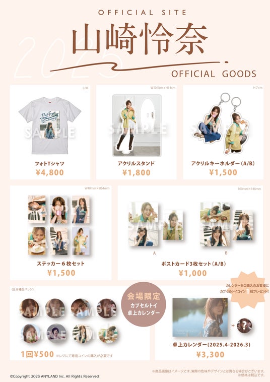 株式会社ANYLAND(本社:東京都渋谷区、代表取締役:黒澤隼人、以下ANYLAND)は、2025年5月11日(日)に開催される山崎怜奈のファンクラブ会員限定イベント『Rena Yamazaki 28th Birthday Event』の会場にて、限定グッズを販売することをお知らせいたします。また、同日20:00より「山崎怜奈 OFFICIAL STORE」にて通信販売も開始いたします。