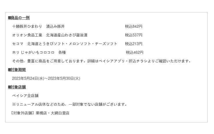 株式会社ベイシア(本社:群馬県前橋市、代表取締役社長:相木孝仁)は、5月24日(水)から5月30日(火)までの期間で、「北海道フェア」を開催いたします。海鮮からお肉、スイーツまで北海道内の名物グルメが勢ぞろいし、ご自宅にいながら旅行気分を楽しめます。ぜひご自宅で“北海道を食べて”みてはいかがでしょうか。
