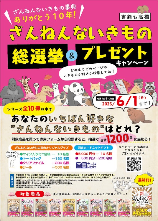 「ざんねんないきもの事典」シリーズ第1~10弾のキャンペーン専用帯に印刷されている二次元コードから、いちばん好きな“ざんねんないきもの”を投票。人気のざんねんないきものBest10を発表いたします。(発表は2025年夏頃を予定)