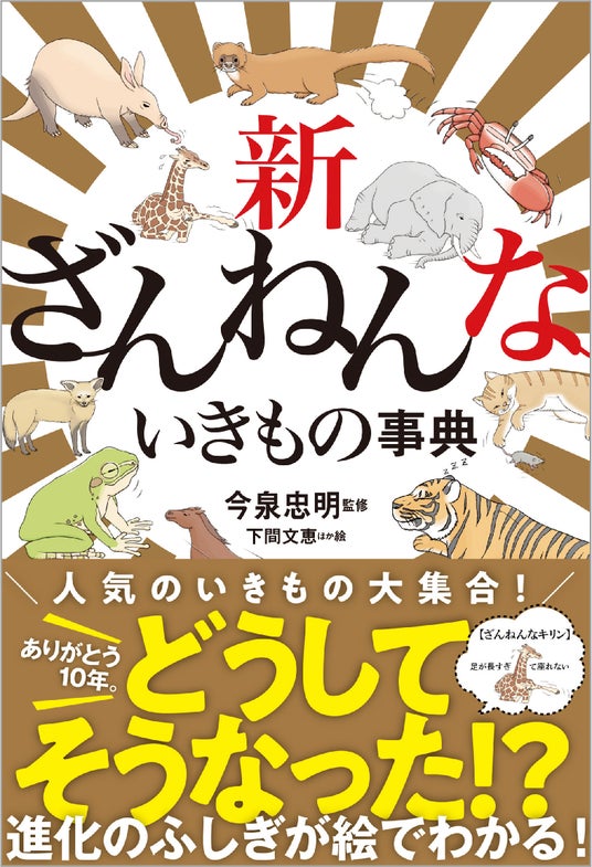 「ざんねんないきもの」とは一生けんめいなのに、どこかざんねんないきものたちのことです。「ざんねんないきもの事典」シリーズは10年目を迎え、累計発行部数540万部を突破しました。シリーズ第10弾では、新しい形で「ざんねんないきもの」を紹介。装丁や本文をリニューアルしました。この10年の研究で進歩した研究結果をふまえ、進化の歴史や生き物の分類の変化も加えています。