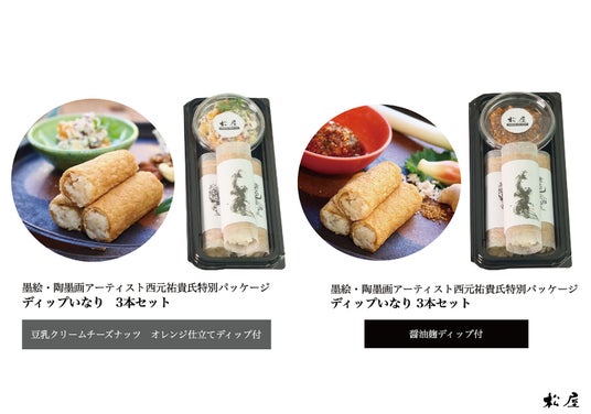 特別パッケージには、今年1月に日本三大稲荷の一つである豊川稲荷寺宝館にて特別公開されたことで話題となった墨絵・陶墨画作品「昇竜」「阿吽の狐」が描かれています。また、いなり寿司をディップするソースは「醤油麹香味野菜」と「豆乳クリームチーズナッツオレンジ仕立て」の2種類からお選びいただけます。