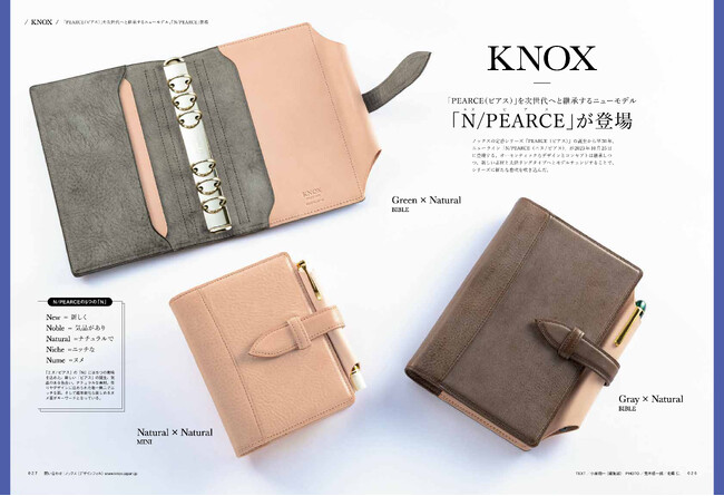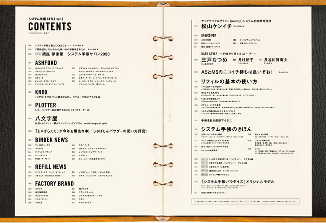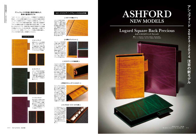 2023~2024年の注目製品を豊富な写真で詳解しています。ASHFORD(アシュフォード)は「ルガードスクエアバック プレシャス」「サントシャペル」などの新製品情報や、公式オンラインショップ限定のバインダー情報もたっぷりとご紹介。KNOX(ノックス)は、代表作「PEARCE(ピアス)」を次世代へと継承したニューモデル「N/PEARCE(エヌ/ピアス)」の魅力に迫っています。また、代表的なシステム手帳ブランドの最新情報だけでなく、職人の個性が光る革工房の職人が手がけるバインダーも集めました。