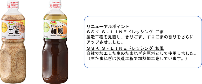 エスエスケイフーズ株式会社(本社:静岡市葵区)は、日頃ご愛顧いただいている「SSK S‐LINEドレッシング」の「ごま」・「和風」の2品を、さらにおいしくリニューアルいたします。