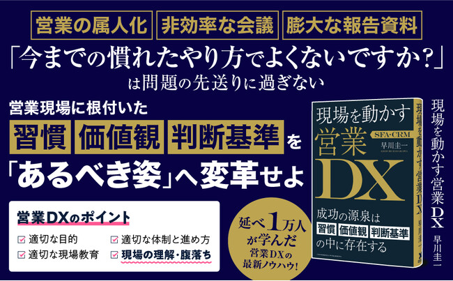 2022年10月3日、株式会社クロスメディア・パブリッシング(本社:東京都渋谷区、代表取締役社長:小早川幸一郎)は、書籍『現場を動かす営業DX』を刊行しました。本書は、数多くの営業組織の変革に実績を持つ、株式会社MCネクストの代表取締役である早川圭一氏による「営業現場を人から変革する」メソッドを、具体的に解説した一冊です。