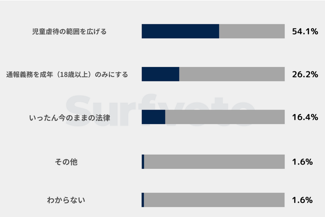 現行では「児童虐待」は保護者からの虐待にのみ「第三者」は適用されず。回答者の54.1%は「児童虐待の範囲を広げる」、次いで26.2%が「通報義務を成年(18歳以上)のみにする」