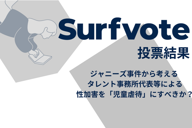 SNSとテクノロジーで社会課題の発見・解決をサポートするICTスタートアップのPolimill株式会社(ポリミル、本社:東京都港区、代表取締役:横田えり、以下Polimill社)は当社が運営・開発する社会デザインプラットフォームSurfvoteで、2023年6月21日から8月31日までの期間、イシュー(課題)「ジャニーズ事件から考える タレント事務所代表等による性加害を『児童虐待』にすべきか?」について、ユーザーの意見投票を行いましたので、その結果をお知らせいたします。https://surfvote.com/issues/byldwvu0dd7a