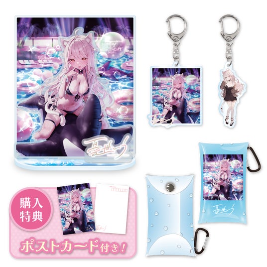アクリルスタンドやアクリルキーホルダー、ラメ入りマルチケースなど、繊細で透明感のあるアイテムが揃います。全種セットには限定ポストカードも付属しており、憂世いうの世界観をまるごと楽しめる内容となっています。