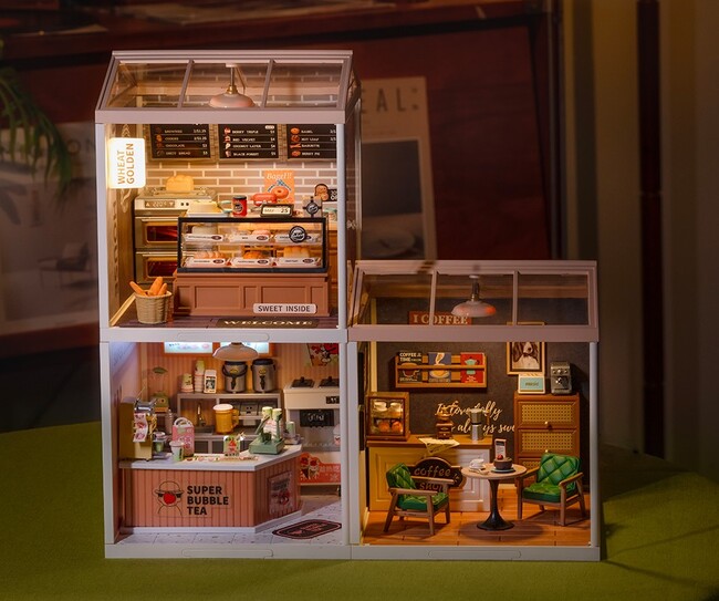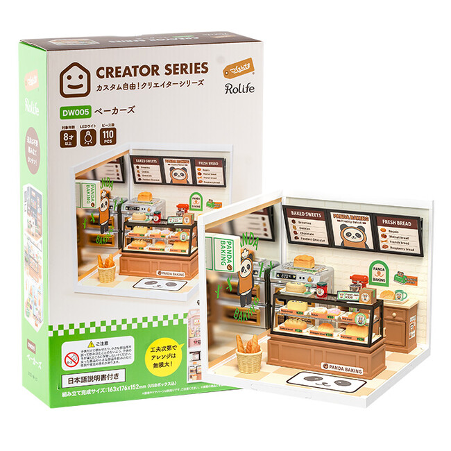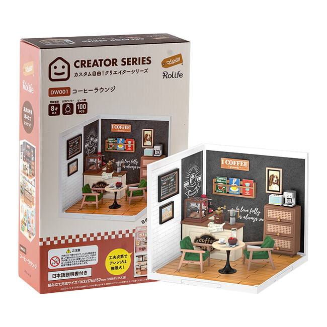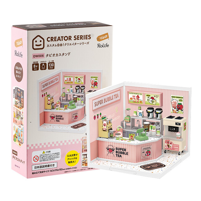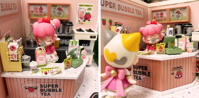 『クリエイターシリーズ』は、好きなフィギュアや人形と一緒に飾ったり、写真を撮ったりしてもお楽しみいただけます。簡単につくれるので、フィギュアや人形の世界観に合わせて、壁紙や床を変えるなどミニチュアハウス全体をアレンジするのもおすすめ。また、プラスチック製のミニチュアハウスなので、カプセルトイなどのミニチュア家具や小物とも相性がよいです。タピオカスタンドやパン屋の店員風にフィギュアを飾ったり、椅子に座らせて飾ったり自由にお楽しみください。