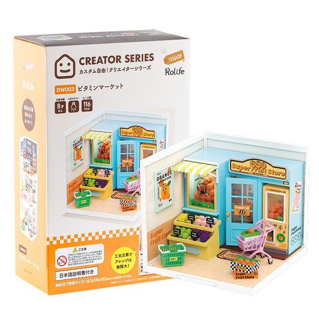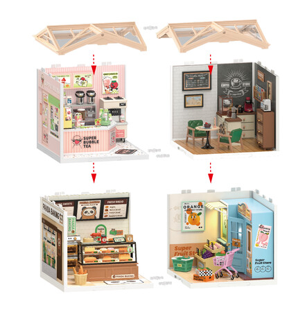 タピオカスタンドはメニュー看板、ベーカーズはオーブンと突き出し看板、ビタミンマーケットは左側のオレンジが入ったショーケースが光ります。屋根パーツを付けた場合には、天井のLEDライトを付けることもでき、ライトが灯るとひと味ちがった雰囲気をお楽しみいただけます。