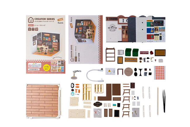 『クリエイターシリーズ』は、つくるんです(R)シリーズ初のプラスチック製ミニチュアハウスキット。プラスチック製のパーツをパチパチと組み立てていくだけで完成し、看板や壁に掛けられた絵画はシールになっているので、接着剤も不要です。制作目安時間は、1時間ほどとシリーズの中で一番短く、細かい作業が苦手な方でも簡単につくることができます。