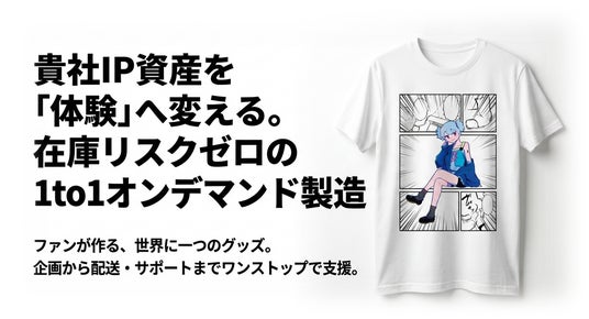 ユーザーが自らデザインを行う参加型システムにより、在庫リスクをゼロに抑えつつ、ファンとの深い絆を創出します。2025年度より大手出版社様との取り組みも開始し、製造、配送、BPOまでを完全ワンストップで支援し、IPビジネスの新たな価値をご提案しております。
