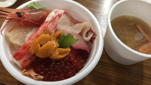釧路名物オリジナル海鮮丼「勝手丼」は、お好みの魚介類を選び、その場で好きなだけ選んで盛り付けることができます。