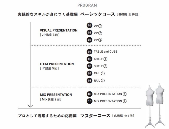 全10回となるベーシックコース(基礎編)の講義では、座学と実践を通じて最新のヴィジュアルマーチャンダイジングのトレンドを学びます。ベーシックコース終了後はマスターコース(応用編)の受講も可能となり、マスターコースを修了し、ディプロマ認定試験* に合格した方には、VMS 認定マークを授与します。