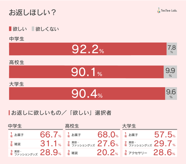 また、「お返しが欲しい」と回答した人にお返しに欲しい物を聞いたところ、いずれの年代においても、第1位は「お菓子」と回答した人が多く、中学生の第2位は「雑貨」、高校生・大学生の第2位は「美容・ファッショングッズ」と続きました。